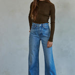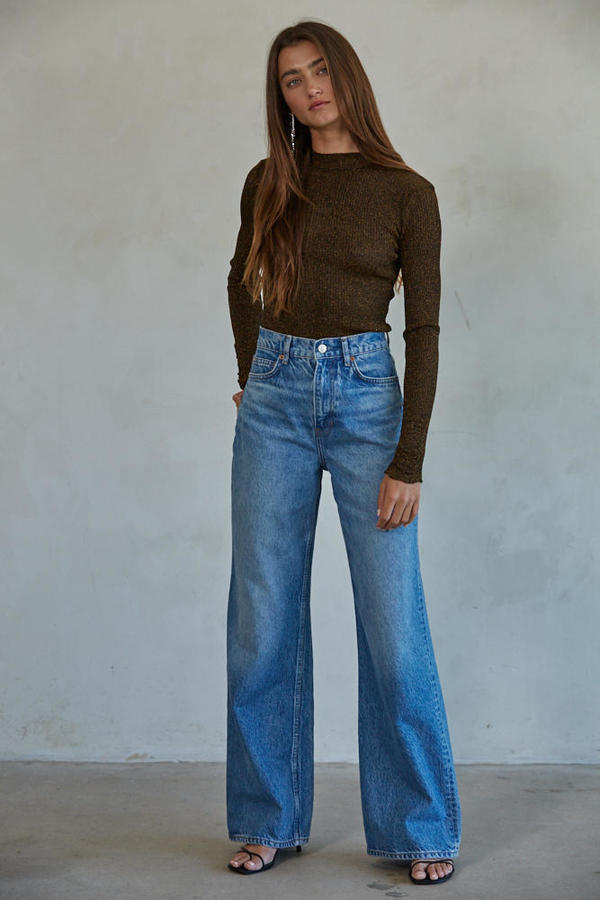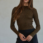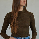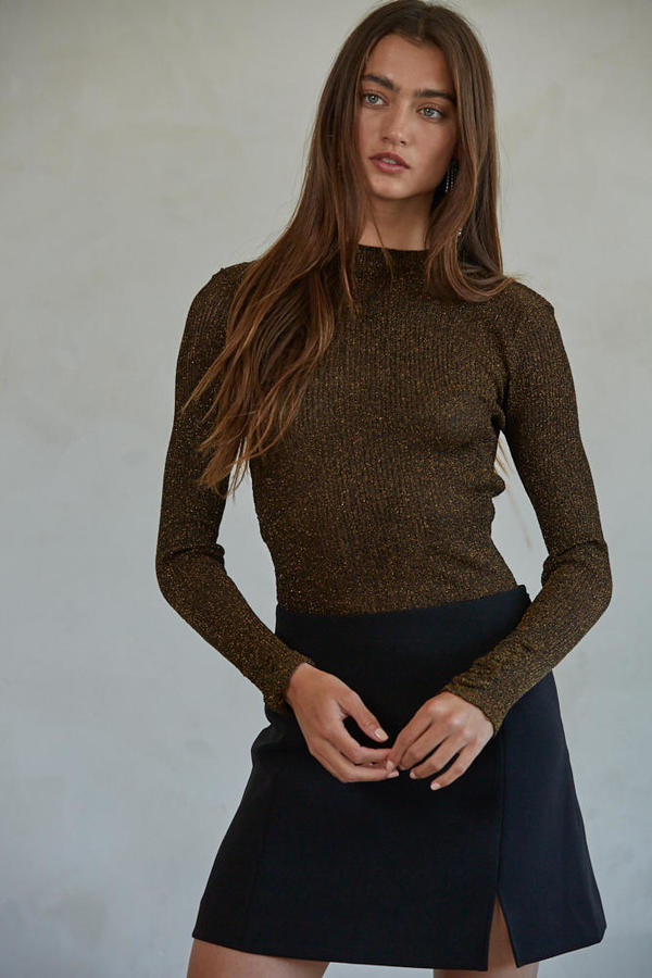 A ribbed black knit bodysuit woven with gold shimmer for a luxe, glowing finish.