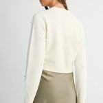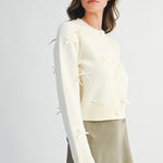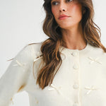Knit cardigan with crew neckline and long sleeves. Fabric ribbon details. Front button closure. Ribbed trim at the cuffs and hem.