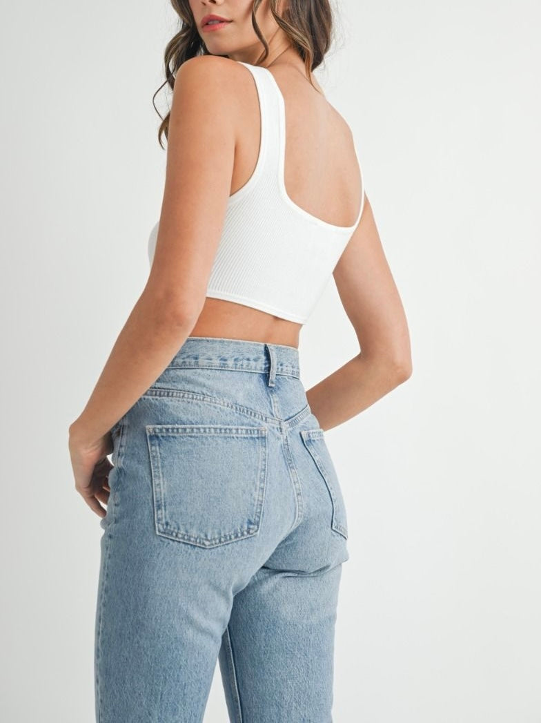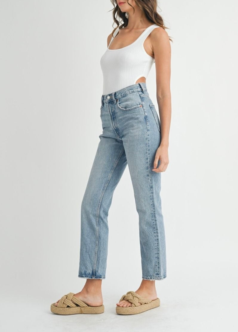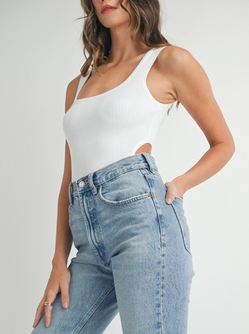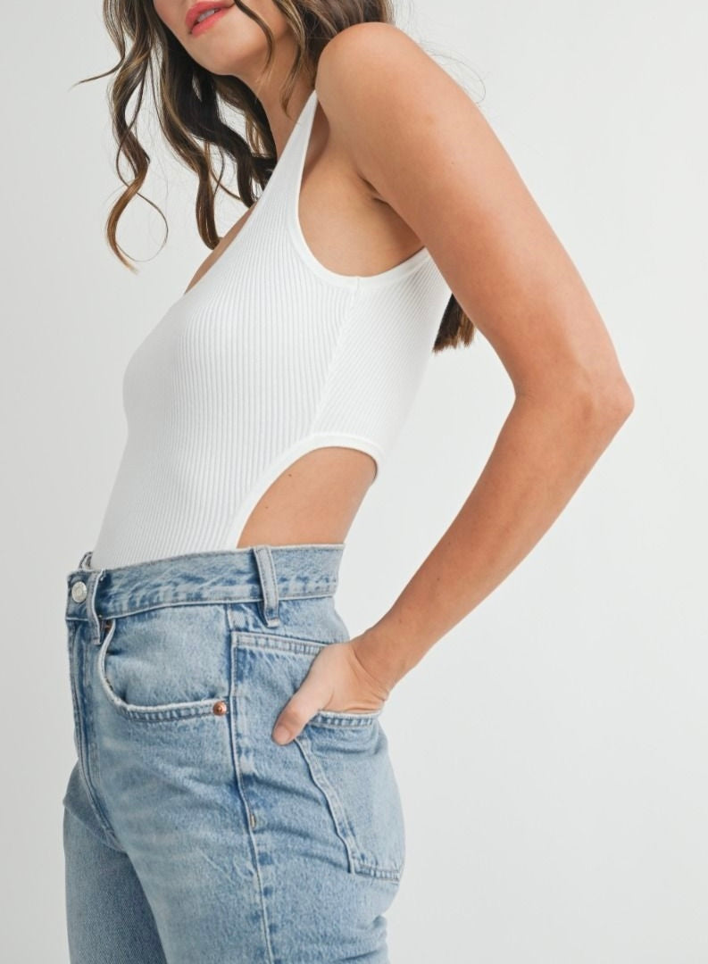 Solid ribbed sleeveless back and side cut out detail bodysuit with snap closure.