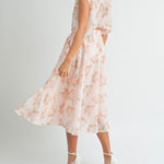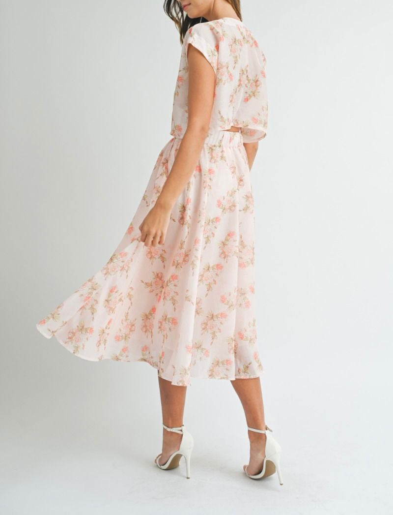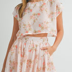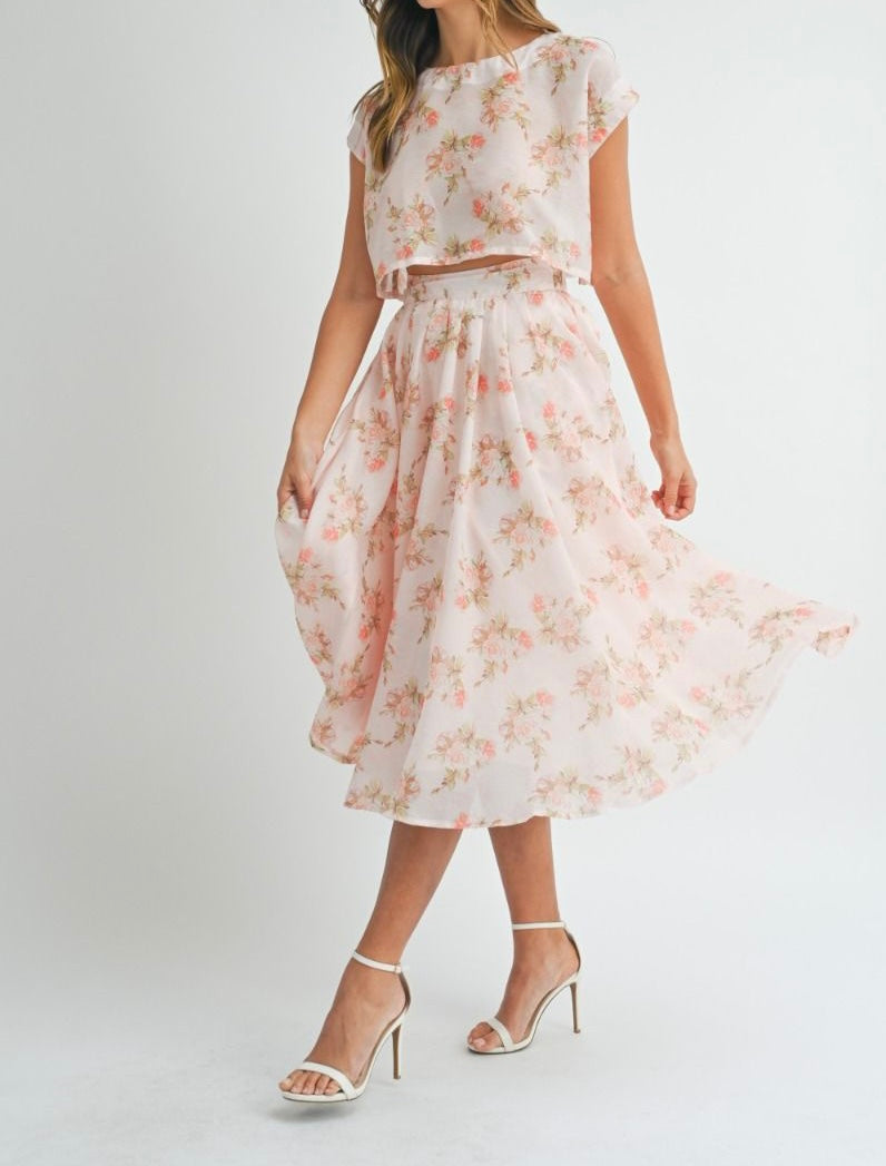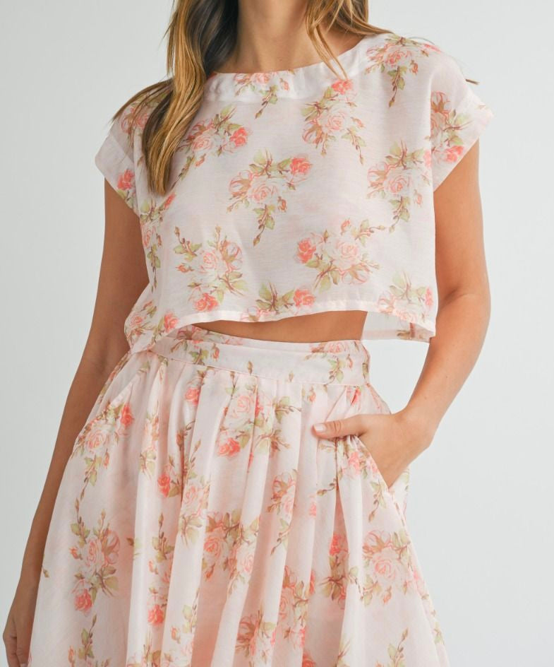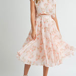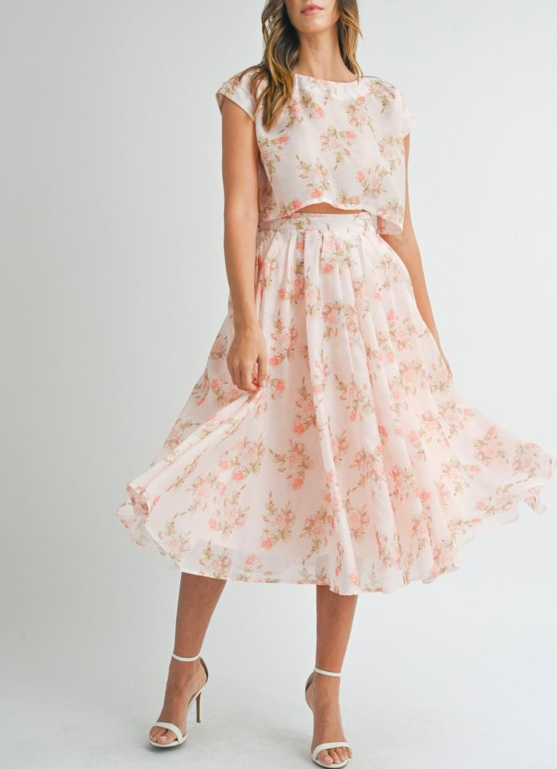 Floral print crop top and midi flare skirt with side pocket set. Lining.